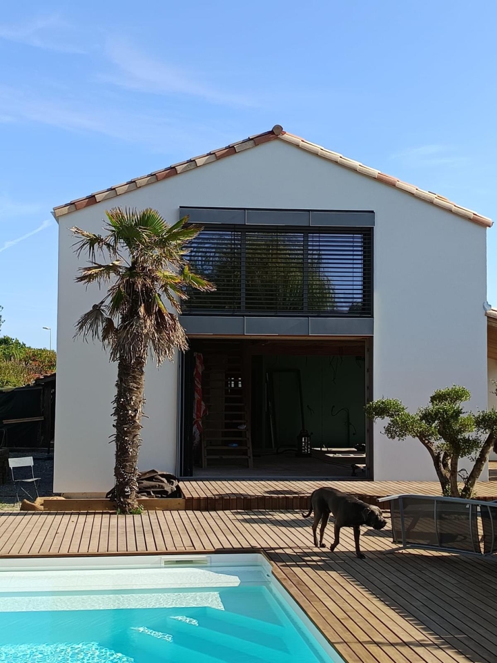 Brise-soleils alu, Ile d'Oléron Brise-soleils à lames orientables, cachés avec des encadrements en alu, fabriqués sur mesure avec des joints debout.