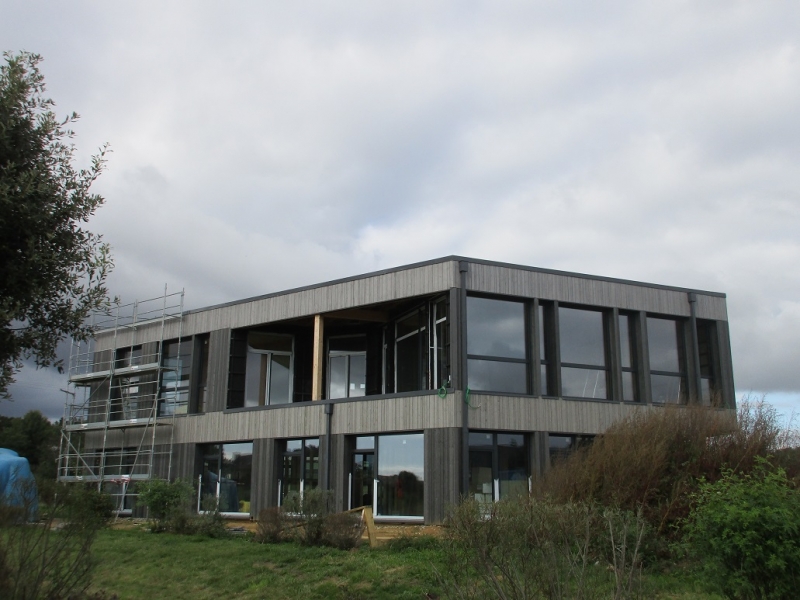 Nous avons fini la façade pour les bureaux à Baden:le bardage est en épicéa nordique , pas raboté, teinté en trois couleurs et découpé en trois largeurs. Les fenêtres PVC , les descentes et couvertines en anthracite.